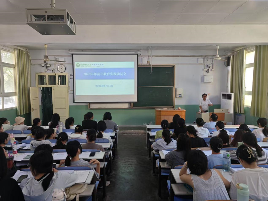 2025年6月15日下午,yl23455永利官网在教2-T2召开2022级师范生教育实践动员大会。副院长闫军辉、教学秘书刘晓咏、地理科学系主任陈飞燕、信阳高级中学教师刘俊峰、2022级地理科学专业全体学生180余人参加了动员会,动员会由陈飞燕主持。