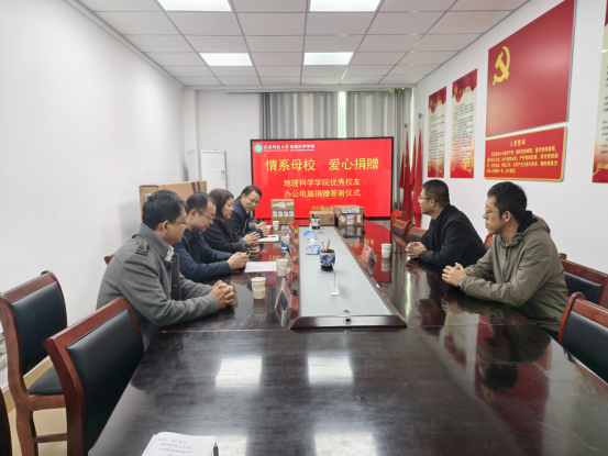 2025年11月13日上午,地理科学院迎来了一份饱含深情的礼物——永利官网优秀校友,2011级地理科学专业殷红松校友向学院捐赠了高性能笔记本电脑、电子屏幕等一批设备,用于优化学院办公条件,提升教学科研支持能力。捐赠仪式在学院403会议室隆重举行,永利官网全体党政领导出席仪式。